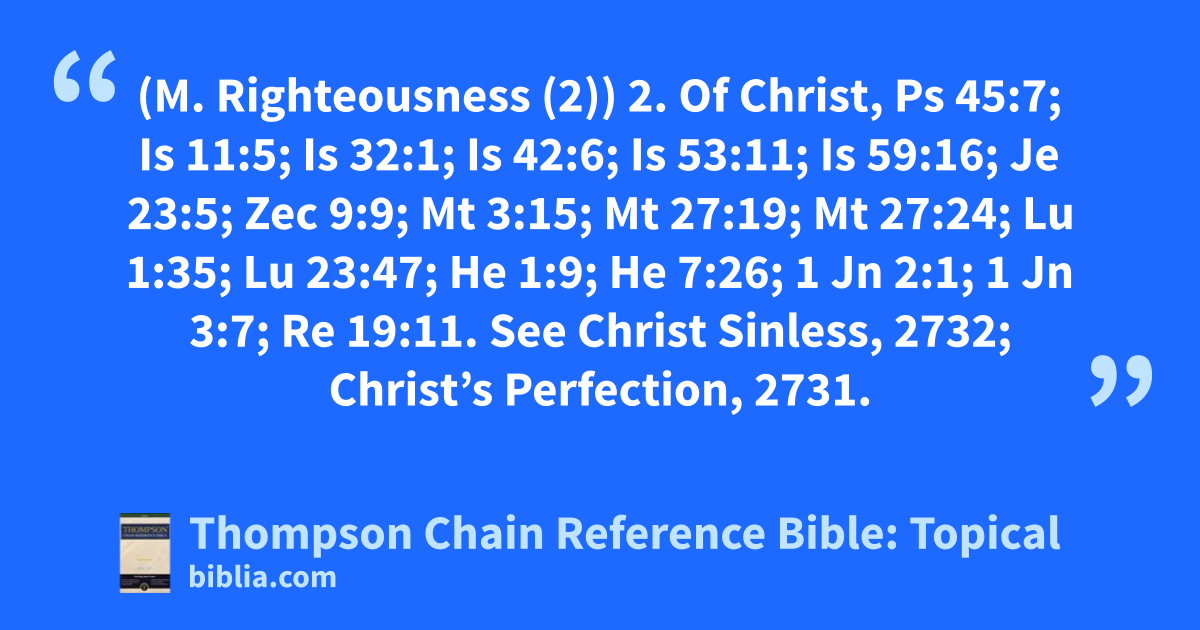 (M. Righteousness (2)) 2. Of Christ, Ps 45:7; Is 11:5; Is 32:1; Is 42:6; Is 53:11; Is 59:16; Je 23:5; Zec 9:9; Mt 3:15; Mt 27:19; Mt 27:24; Lu 1:35; Lu 23:47; He 1:9; He 7:26; 1 Jn 2:1; 1 Jn 3:7; Re 19:11. See Christ Sinless, 2732; Christ’s Perfection, 2731.