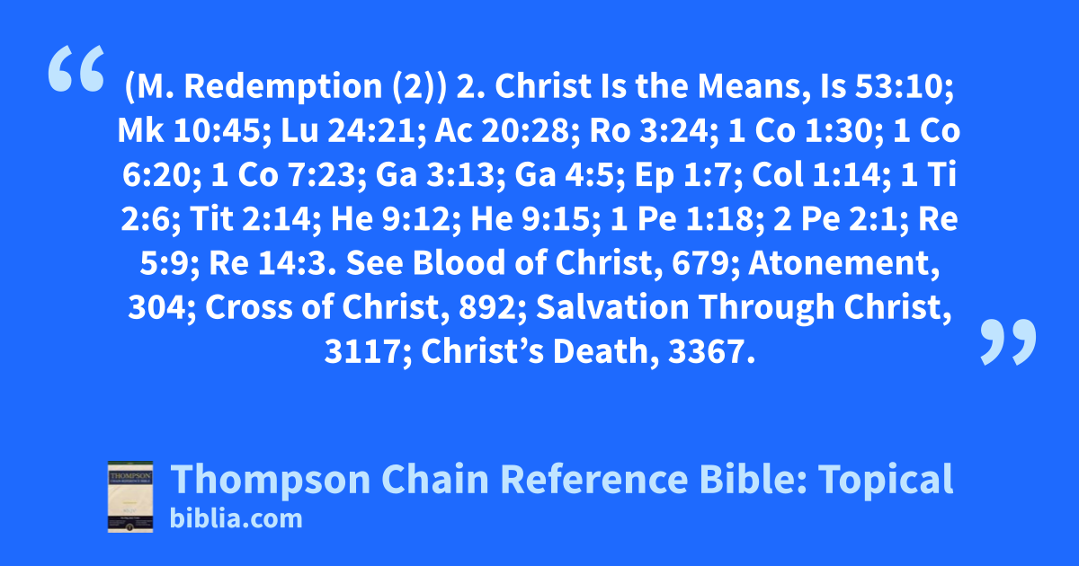 (M. Redemption (2)) 2. Christ Is the Means, Is 53:10; Mk 10:45; Lu 24:21; Ac 20:28; Ro 3:24; 1 Co 1:30; 1 Co 6:20; 1 Co 7:23; Ga 3:13; Ga 4:5; Ep 1:7; Col 1:14; 1 Ti 2:6; Tit 2:14; He 9:12; He 9:15; 1 Pe 1:18; 2 Pe 2:1; Re 5:9; Re 14:3. See Blood of Christ, 679; Atonement, 304; Cross of Christ, 892; Salvation Through Christ, 3117; Christ’s Death, 3367.