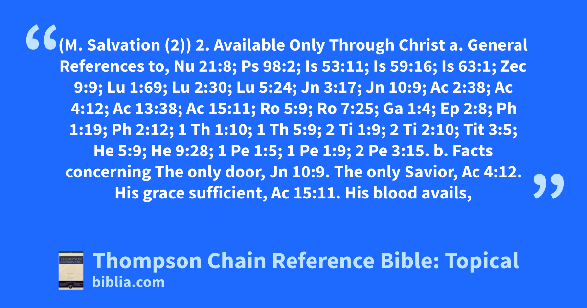 (M. Salvation (2)) 2. Available Only Through Christ a. General References to, Nu 21:8; Ps 98:2; Is 53:11; Is 59:16; Is 63:1; Zec 9:9; Lu 1:69; Lu 2:30; Lu 5:24; Jn 3:17; Jn 10:9; Ac 2:38; Ac 4:12; Ac 13:38; Ac 15:11; Ro 5:9; Ro 7:25; Ga 1:4; Ep 2:8; Ph 1:19; Ph 2:12; 1 Th 1:10; 1 Th 5:9; 2 Ti 1:9; 2 Ti 2:10; Tit 3:5; He 5:9; He 9:28; 1 Pe 1:5; 1 Pe 1:9; 2 Pe 3:15. b. Facts concerning The only door, Jn 10:9. The only Savior, Ac 4:12. His grace sufficient, Ac 15:11. His blood avails,