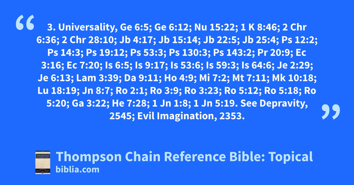 3. Universality, Ge 6:5; Ge 6:12; Nu 15:22; 1 K 8:46; 2 Chr 6:36; 2 Chr 28:10; Jb 4:17; Jb 15:14; Jb 22:5; Jb 25:4; Ps 12:2; Ps 14:3; Ps 19:12; Ps 53:3; Ps 130:3; Ps 143:2; Pr 20:9; Ec 3:16; Ec 7:20; Is 6:5; Is 9:17; Is 53:6; Is 59:3; Is 64:6; Je 2:29; Je 6:13; Lam 3:39; Da 9:11; Ho 4:9; Mi 7:2; Mt 7:11; Mk 10:18; Lu 18:19; Jn 8:7; Ro 2:1; Ro 3:9; Ro 3:23; Ro 5:12; Ro 5:18; Ro 5:20; Ga 3:22; He 7:28; 1 Jn 1:8; 1 Jn 5:19. See Depravity, 2545; Evil Imagination, 2353.