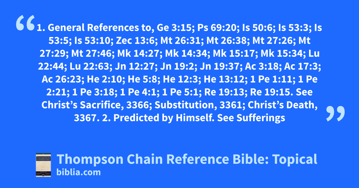 1. General References to, Ge 3:15; Ps 69:20; Is 50:6; Is 53:3; Is 53:5; Is 53:10; Zec 13:6; Mt 26:31; Mt 26:38; Mt 27:26; Mt 27:29; Mt 27:46; Mk 14:27; Mk 14:34; Mk 15:17; Mk 15:34; Lu 22:44; Lu 22:63; Jn 12:27; Jn 19:2; Jn 19:37; Ac 3:18; Ac 17:3; Ac 26:23; He 2:10; He 5:8; He 12:3; He 13:12; 1 Pe 1:11; 1 Pe 2:21; 1 Pe 3:18; 1 Pe 4:1; 1 Pe 5:1; Re 19:13; Re 19:15. See Christ’s Sacrifice, 3366; Substitution, 3361; Christ’s Death, 3367. 2. Predicted by Himself. See Sufferings