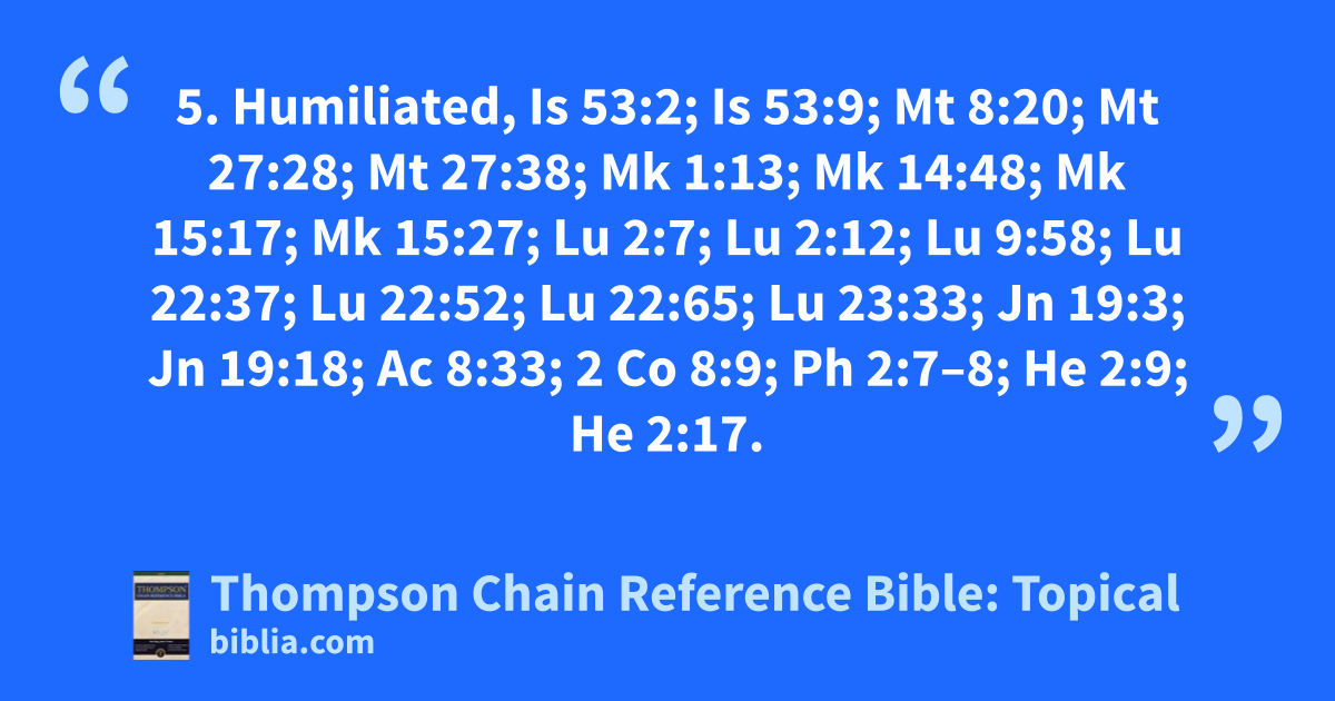 5. Humiliated, Is 53:2; Is 53:9; Mt 8:20; Mt 27:28; Mt 27:38; Mk 1:13; Mk 14:48; Mk 15:17; Mk 15:27; Lu 2:7; Lu 2:12; Lu 9:58; Lu 22:37; Lu 22:52; Lu 22:65; Lu 23:33; Jn 19:3; Jn 19:18; Ac 8:33; 2 Co 8:9; Ph 2:7–8; He 2:9; He 2:17.