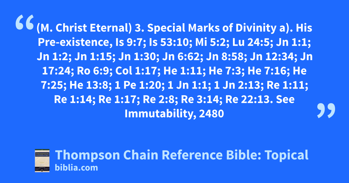 (M. Christ Eternal) 3. Special Marks of Divinity a). His Pre-existence, Is 9:7; Is 53:10; Mi 5:2; Lu 24:5; Jn 1:1; Jn 1:2; Jn 1:15; Jn 1:30; Jn 6:62; Jn 8:58; Jn 12:34; Jn 17:24; Ro 6:9; Col 1:17; He 1:11; He 7:3; He 7:16; He 7:25; He 13:8; 1 Pe 1:20; 1 Jn 1:1; 1 Jn 2:13; Re 1:11; Re 1:14; Re 1:17; Re 2:8; Re 3:14; Re 22:13. See Immutability, 2480