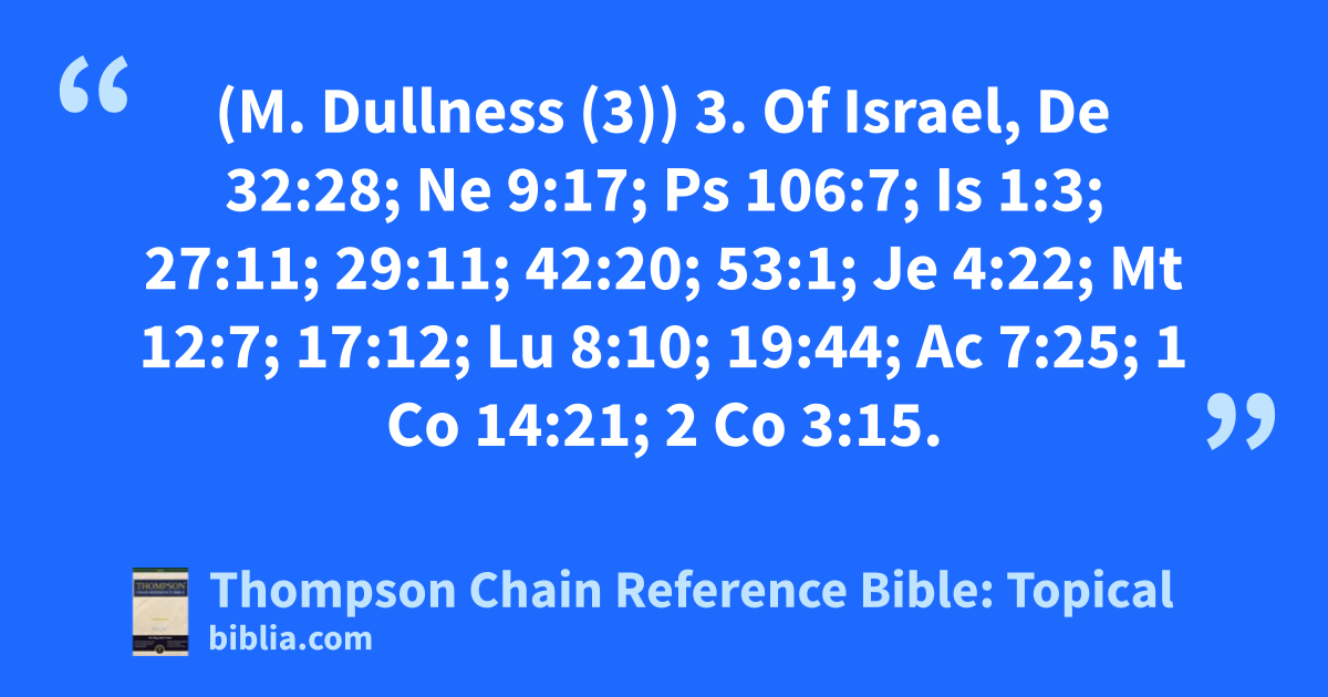 (M. Dullness (3)) 3. Of Israel, De 32:28; Ne 9:17; Ps 106:7; Is 1:3; 27:11; 29:11; 42:20; 53:1; Je 4:22; Mt 12:7; 17:12; Lu 8:10; 19:44; Ac 7:25; 1 Co 14:21; 2 Co 3:15.