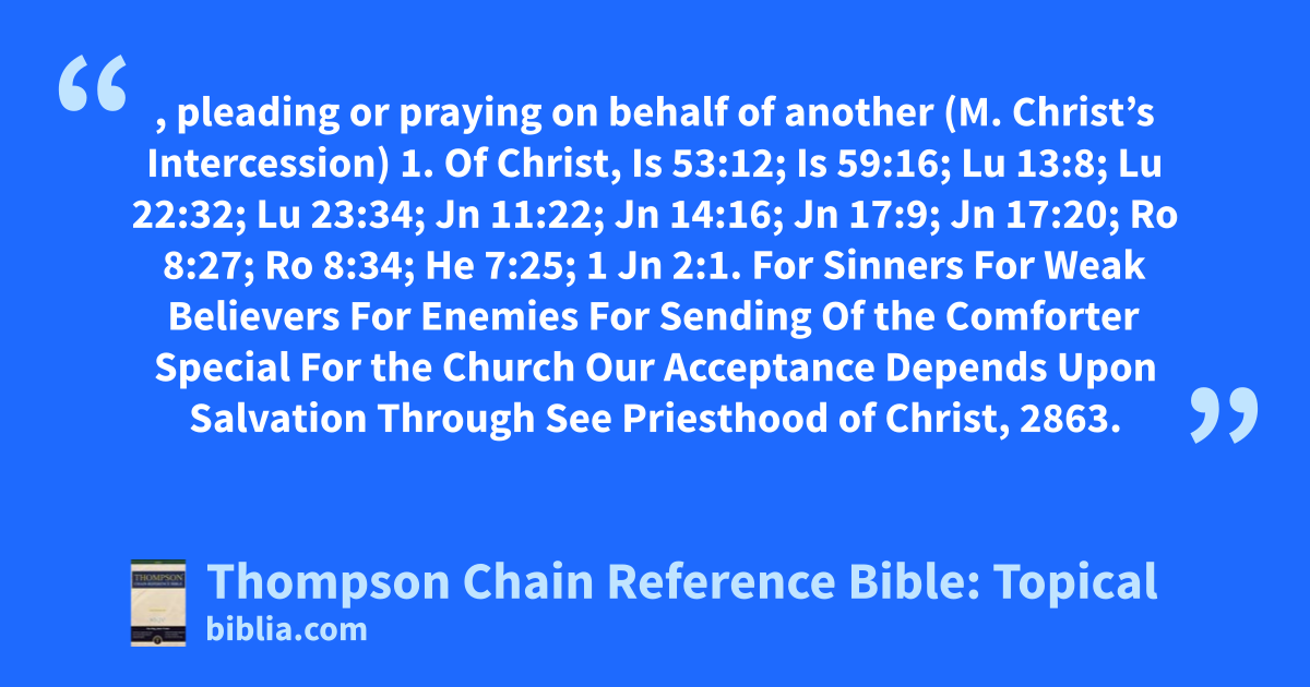, pleading or praying on behalf of another (M. Christ’s Intercession) 1. Of Christ, Is 53:12; Is 59:16; Lu 13:8; Lu 22:32; Lu 23:34; Jn 11:22; Jn 14:16; Jn 17:9; Jn 17:20; Ro 8:27; Ro 8:34; He 7:25; 1 Jn 2:1. For Sinners For Weak Believers For Enemies For Sending Of the Comforter Special For the Church Our Acceptance Depends Upon Salvation Through See Priesthood of Christ, 2863.