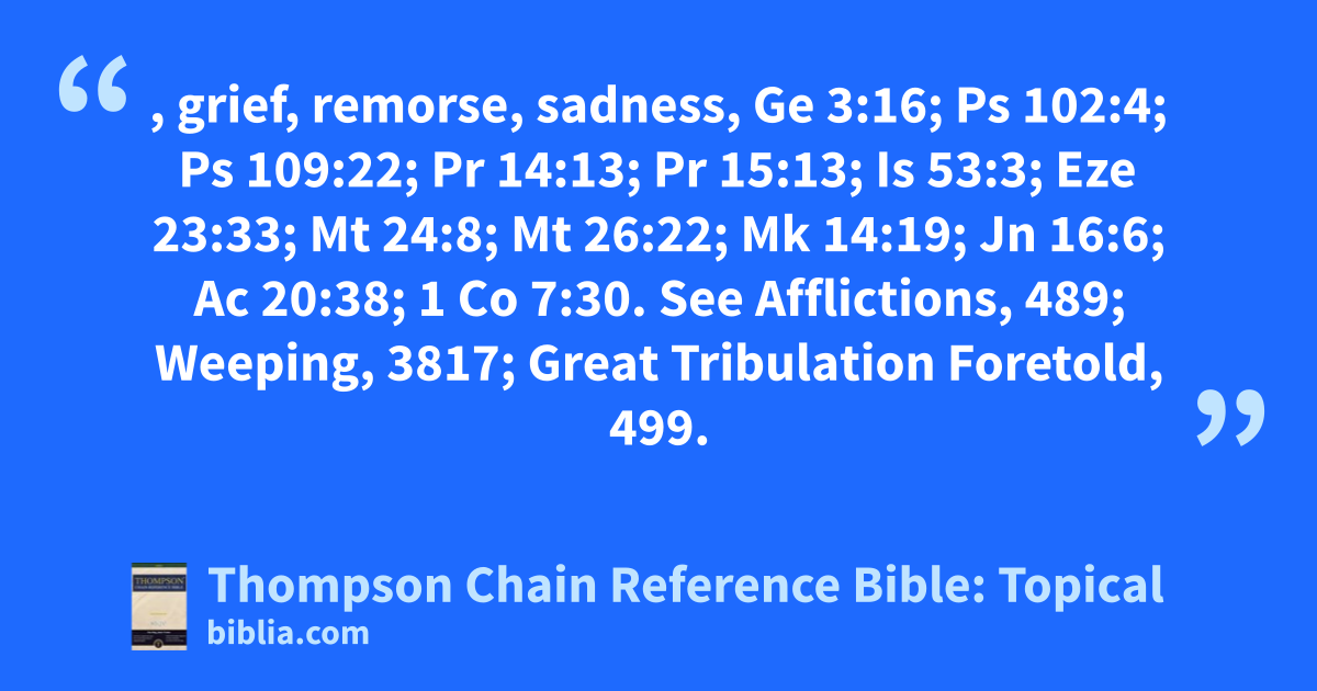 , grief, remorse, sadness, Ge 3:16; Ps 102:4; Ps 109:22; Pr 14:13; Pr 15:13; Is 53:3; Eze 23:33; Mt 24:8; Mt 26:22; Mk 14:19; Jn 16:6; Ac 20:38; 1 Co 7:30. See Afflictions, 489; Weeping, 3817; Great Tribulation Foretold, 499.