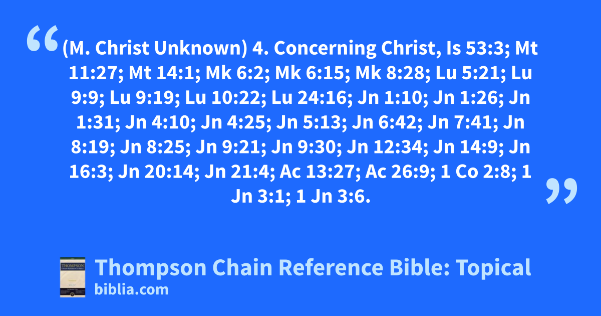 (M. Christ Unknown) 4. Concerning Christ, Is 53:3; Mt 11:27; Mt 14:1; Mk 6:2; Mk 6:15; Mk 8:28; Lu 5:21; Lu 9:9; Lu 9:19; Lu 10:22; Lu 24:16; Jn 1:10; Jn 1:26; Jn 1:31; Jn 4:10; Jn 4:25; Jn 5:13; Jn 6:42; Jn 7:41; Jn 8:19; Jn 8:25; Jn 9:21; Jn 9:30; Jn 12:34; Jn 14:9; Jn 16:3; Jn 20:14; Jn 21:4; Ac 13:27; Ac 26:9; 1 Co 2:8; 1 Jn 3:1; 1 Jn 3:6.