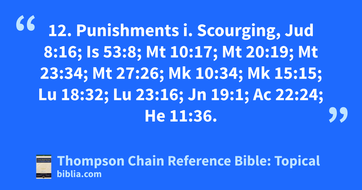 12. Punishments i. Scourging, Jud 8:16; Is 53:8; Mt 10:17; Mt 20:19; Mt 23:34; Mt 27:26; Mk 10:34; Mk 15:15; Lu 18:32; Lu 23:16; Jn 19:1; Ac 22:24; He 11:36.