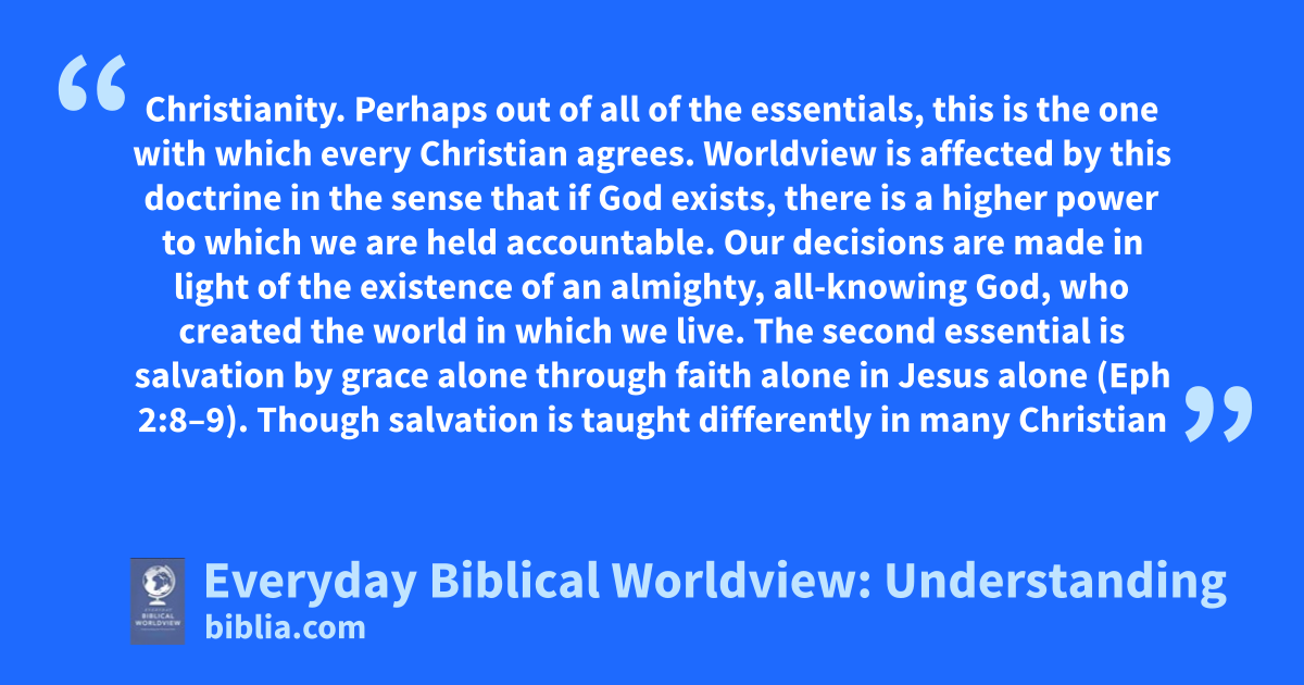 Christianity. Perhaps out of all of the essentials, this is the one with which every Christian agrees. Worldview is affected by this doctrine in the sense that if God exists, there is a higher power to which we are held accountable. Our decisions are made in light of the existence of an almighty, all-knowing God, who created the world in which we live. The second essential is salvation by grace alone through faith alone in Jesus alone (Eph 2:8–9). Though salvation is taught differently in many Christian