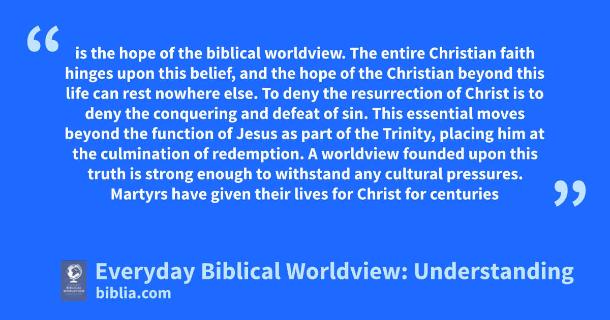 is the hope of the biblical worldview. The entire Christian faith hinges upon this belief, and the hope of the Christian beyond this life can rest nowhere else. To deny the resurrection of Christ is to deny the conquering and defeat of sin. This essential moves beyond the function of Jesus as part of the Trinity, placing him at the culmination of redemption. A worldview founded upon this truth is strong enough to withstand any cultural pressures. Martyrs have given their lives for Christ for centuries