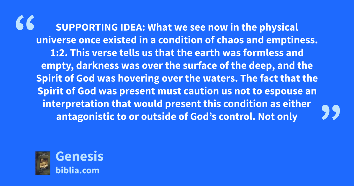SUPPORTING IDEA: What we see now in the physical universe once existed in a condition of chaos and emptiness. 1:2. This verse tells us that the earth was formless and empty, darkness was over the surface of the deep, and the Spirit of God was hovering over the waters. The fact that the Spirit of God was present must caution us not to espouse an interpretation that would present this condition as either antagonistic to or outside of God’s control. Not only
