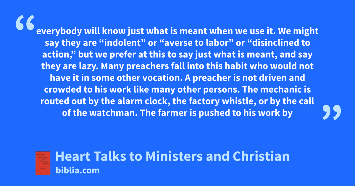 everybody will know just what is meant when we use it. We might say they are “indolent” or “averse to labor” or “disinclined to action,” but we prefer at this to say just what is meant, and say they are lazy. Many preachers fall into this habit who would not have it in some other vocation. A preacher is not driven and crowded to his work like many other persons. The mechanic is routed out by the alarm clock, the factory whistle, or by the call of the watchman. The farmer is pushed to his work by