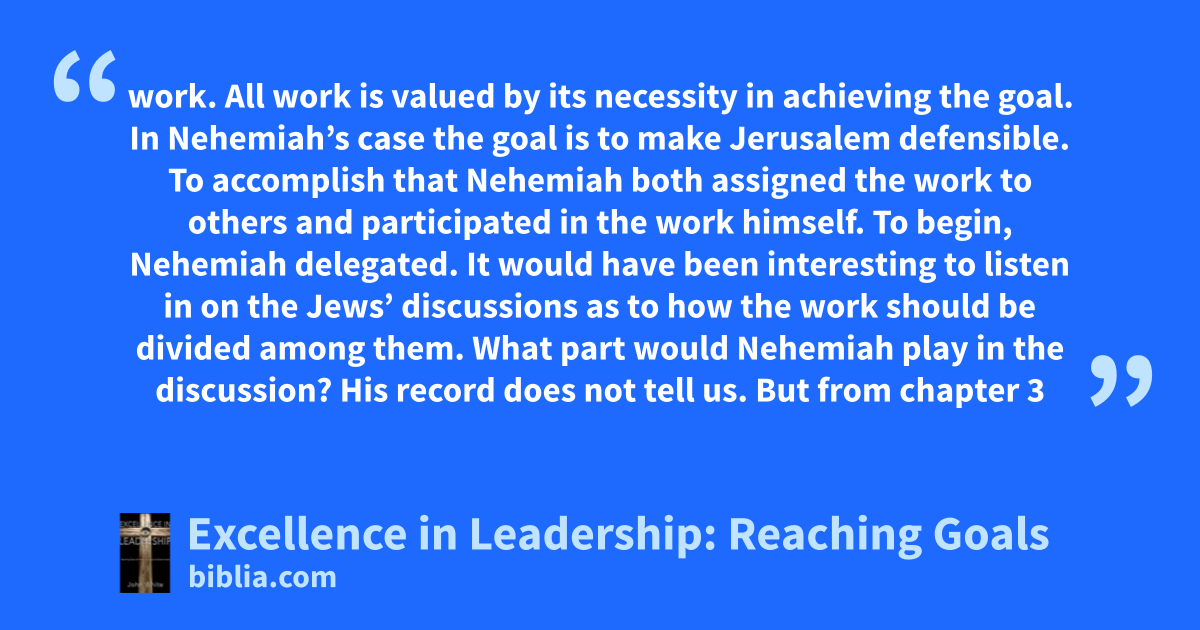 work. All work is valued by its necessity in achieving the goal. In Nehemiah’s case the goal is to make Jerusalem defensible. To accomplish that Nehemiah both assigned the work to others and participated in the work himself. To begin, Nehemiah delegated. It would have been interesting to listen in on the Jews’ discussions as to how the work should be divided among them. What part would Nehemiah play in the discussion? His record does not tell us. But from chapter 3