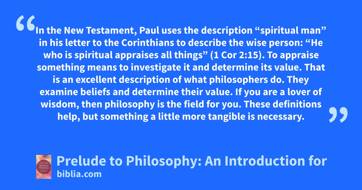 In the New Testament, Paul uses the description “spiritual man” in his letter to the Corinthians to describe the wise person: “He who is spiritual appraises all things” (1 Cor 2:15). To appraise something means to investigate it and determine its value. That is an excellent description of what philosophers do. They examine beliefs and determine their value. If you are a lover of wisdom, then philosophy is the field for you. These definitions help, but something a little more tangible is necessary.