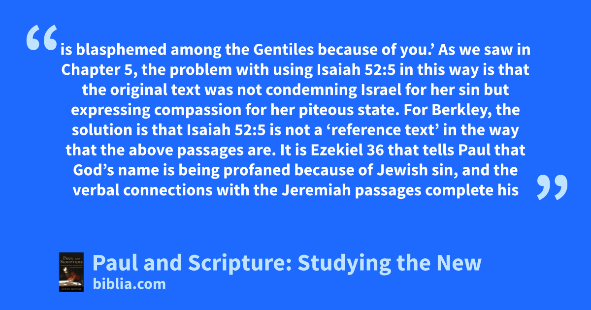 is blasphemed among the Gentiles because of you.’ As we saw in Chapter 5, the problem with using Isaiah 52:5 in this way is that the original text was not condemning Israel for her sin but expressing compassion for her piteous state. For Berkley, the solution is that Isaiah 52:5 is not a ‘reference text’ in the way that the above passages are. It is Ezekiel 36 that tells Paul that God’s name is being profaned because of Jewish sin, and the verbal connections with the Jeremiah passages complete his