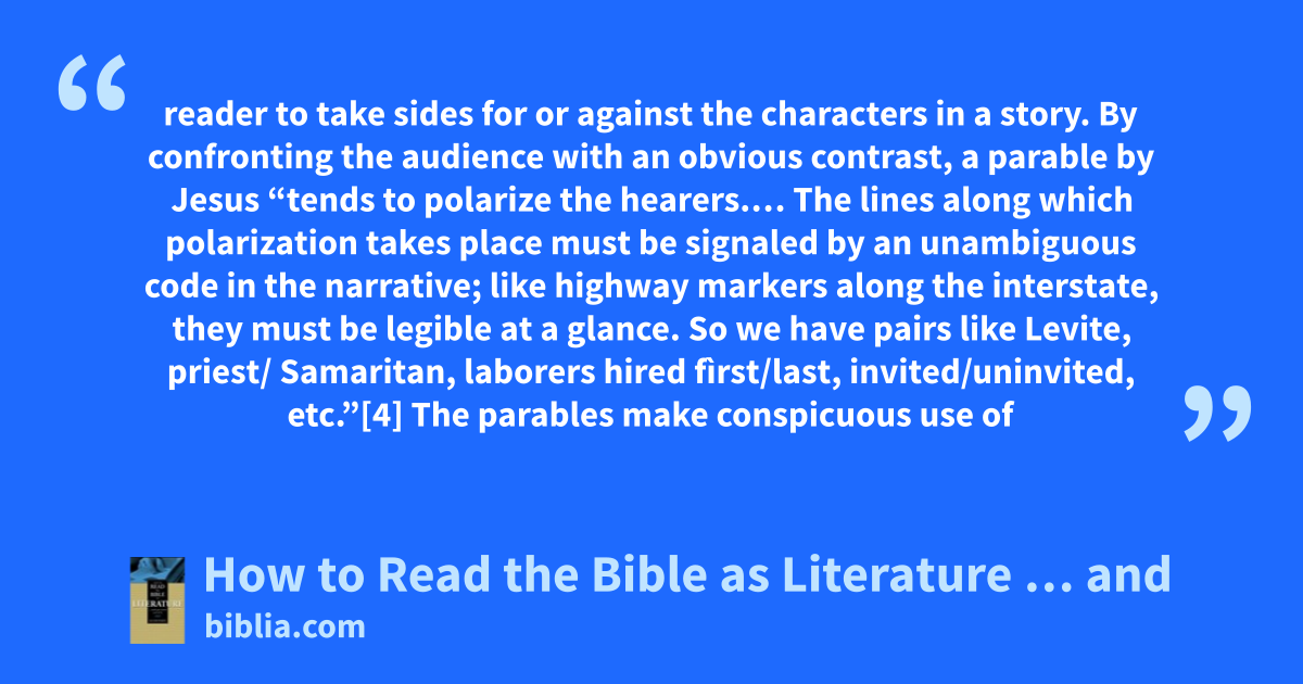 reader to take sides for or against the characters in a story. By confronting the audience with an obvious contrast, a parable by Jesus “tends to polarize the hearers.… The lines along which polarization takes place must be signaled by an unambiguous code in the narrative; like highway markers along the interstate, they must be legible at a glance. So we have pairs like Levite, priest/ Samaritan, laborers hired fìrst/last, invited/uninvited, etc.”[4] The parables make conspicuous use of