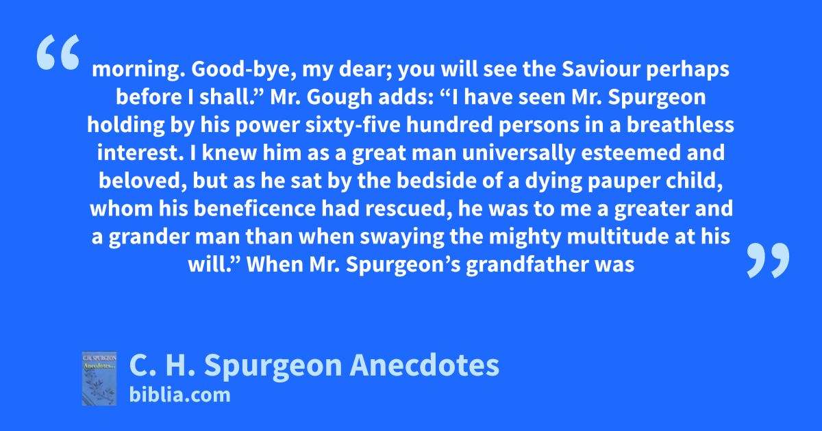 morning. Good-bye, my dear; you will see the Saviour perhaps before I shall.” Mr. Gough adds: “I have seen Mr. Spurgeon holding by his power sixty-five hundred persons in a breathless interest. I knew him as a great man universally esteemed and beloved, but as he sat by the bedside of a dying pauper child, whom his beneficence had rescued, he was to me a greater and a grander man than when swaying the mighty multitude at his will.” When Mr. Spurgeon’s grandfather was