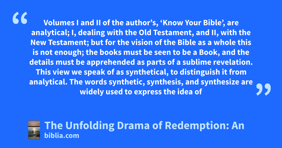 Volumes I and II of the author’s, ‘Know Your Bible’, are analytical; I, dealing with the Old Testament, and II, with the New Testament; but for the vision of the Bible as a whole this is not enough; the books must be seen to be a Book, and the details must be apprehended as parts of a sublime revelation. This view we speak of as synthetical, to distinguish it from analytical. The words synthetic, synthesis, and synthesize are widely used to express the idea of