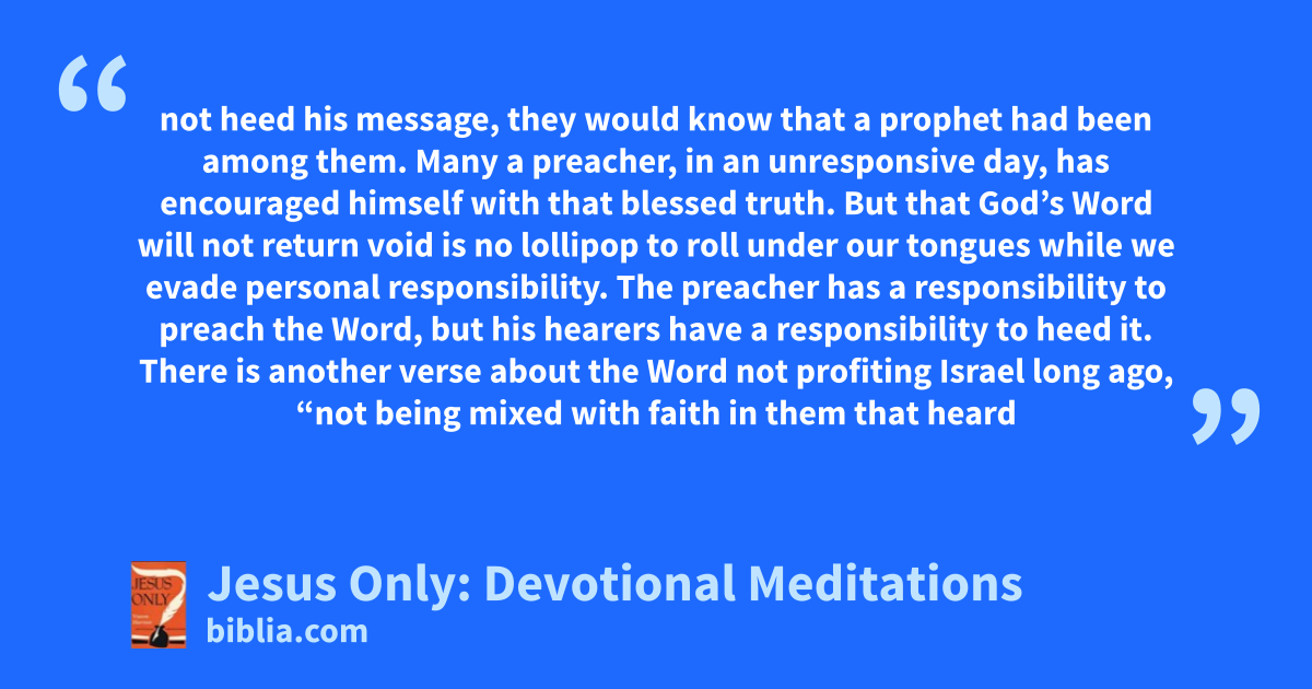 not heed his message, they would know that a prophet had been among them. Many a preacher, in an unresponsive day, has encouraged himself with that blessed truth. But that God’s Word will not return void is no lollipop to roll under our tongues while we evade personal responsibility. The preacher has a responsibility to preach the Word, but his hearers have a responsibility to heed it. There is another verse about the Word not profiting Israel long ago, “not being mixed with faith in them that heard