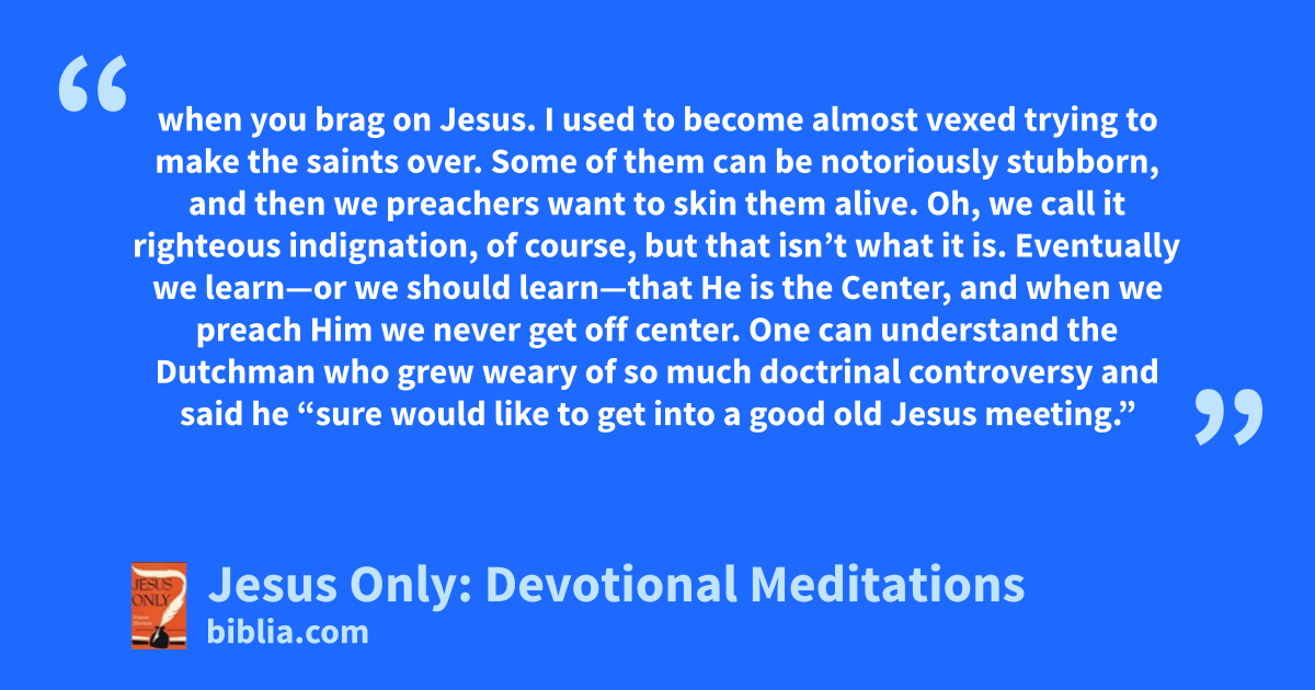 when you brag on Jesus. I used to become almost vexed trying to make the saints over. Some of them can be notoriously stubborn, and then we preachers want to skin them alive. Oh, we call it righteous indignation, of course, but that isn’t what it is. Eventually we learn—or we should learn—that He is the Center, and when we preach Him we never get off center. One can understand the Dutchman who grew weary of so much doctrinal controversy and said he “sure would like to get into a good old Jesus meeting.”