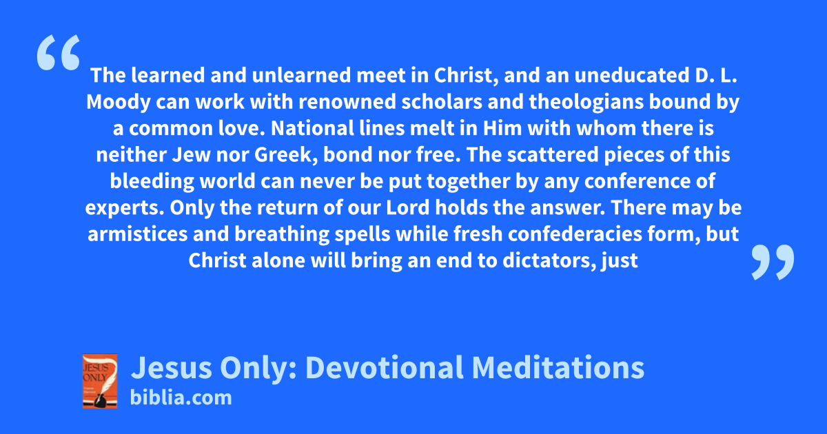 The learned and unlearned meet in Christ, and an uneducated D. L. Moody can work with renowned scholars and theologians bound by a common love. National lines melt in Him with whom there is neither Jew nor Greek, bond nor free. The scattered pieces of this bleeding world can never be put together by any conference of experts. Only the return of our Lord holds the answer. There may be armistices and breathing spells while fresh confederacies form, but Christ alone will bring an end to dictators, just