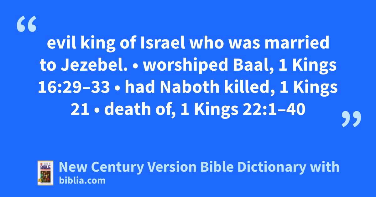 evil king of Israel who was married to Jezebel. • worshiped Baal, 1 Kings 16:29–33 • had Naboth killed, 1 Kings 21 • death of, 1 Kings 22:1–40
