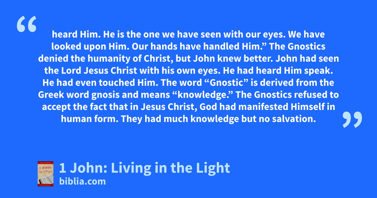 heard Him. He is the one we have seen with our eyes. We have looked upon Him. Our hands have handled Him.” The Gnostics denied the humanity of Christ, but John knew better. John had seen the Lord Jesus Christ with his own eyes. He had heard Him speak. He had even touched Him. The word “Gnostic” is derived from the Greek word gnosis and means “knowledge.” The Gnostics refused to accept the fact that in Jesus Christ, God had manifested Himself in human form. They had much knowledge but no salvation.