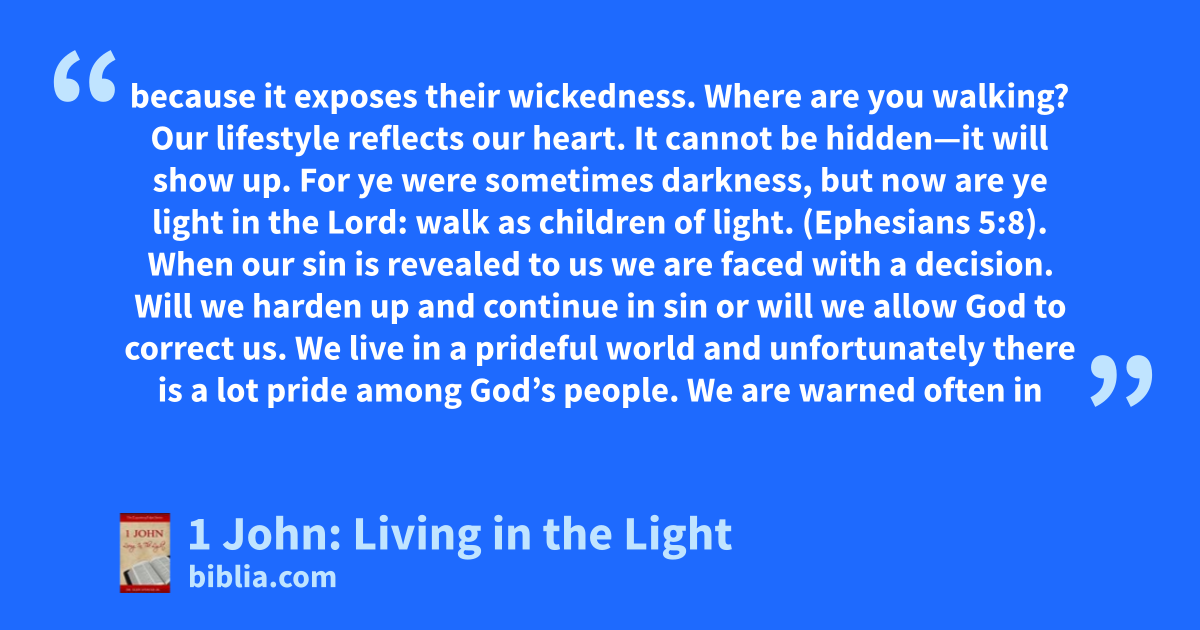 because it exposes their wickedness. Where are you walking? Our lifestyle reflects our heart. It cannot be hidden—it will show up. For ye were sometimes darkness, but now are ye light in the Lord: walk as children of light. (Ephesians 5:8). When our sin is revealed to us we are faced with a decision. Will we harden up and continue in sin or will we allow God to correct us. We live in a prideful world and unfortunately there is a lot pride among God’s people. We are warned often in