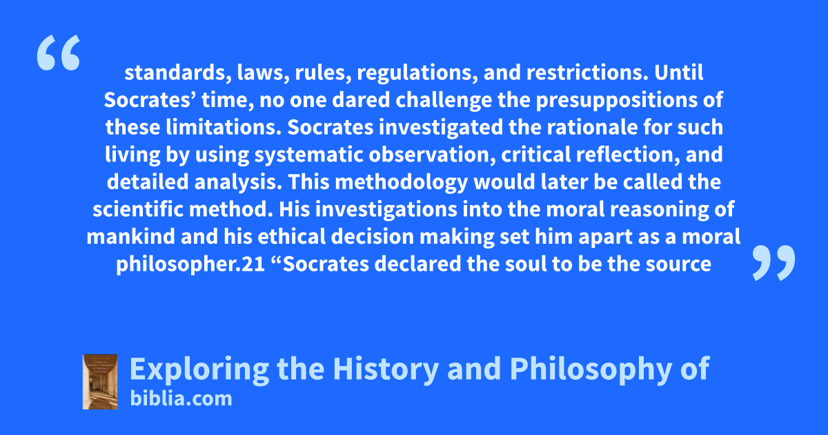 standards, laws, rules, regulations, and restrictions. Until Socrates’ time, no one dared challenge the presuppositions of these limitations. Socrates investigated the rationale for such living by using systematic observation, critical reflection, and detailed analysis. This methodology would later be called the scientific method. His investigations into the moral reasoning of mankind and his ethical decision making set him apart as a moral philosopher.21 “Socrates declared the soul to be the source