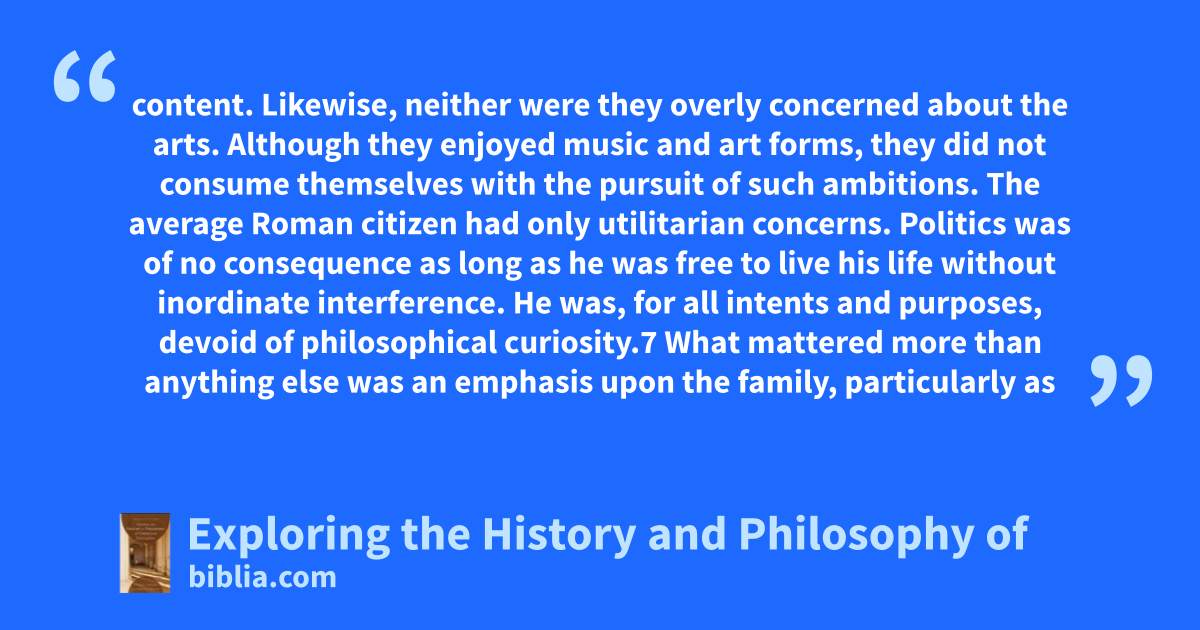 content. Likewise, neither were they overly concerned about the arts. Although they enjoyed music and art forms, they did not consume themselves with the pursuit of such ambitions. The average Roman citizen had only utilitarian concerns. Politics was of no consequence as long as he was free to live his life without inordinate interference. He was, for all intents and purposes, devoid of philosophical curiosity.7 What mattered more than anything else was an emphasis upon the family, particularly as