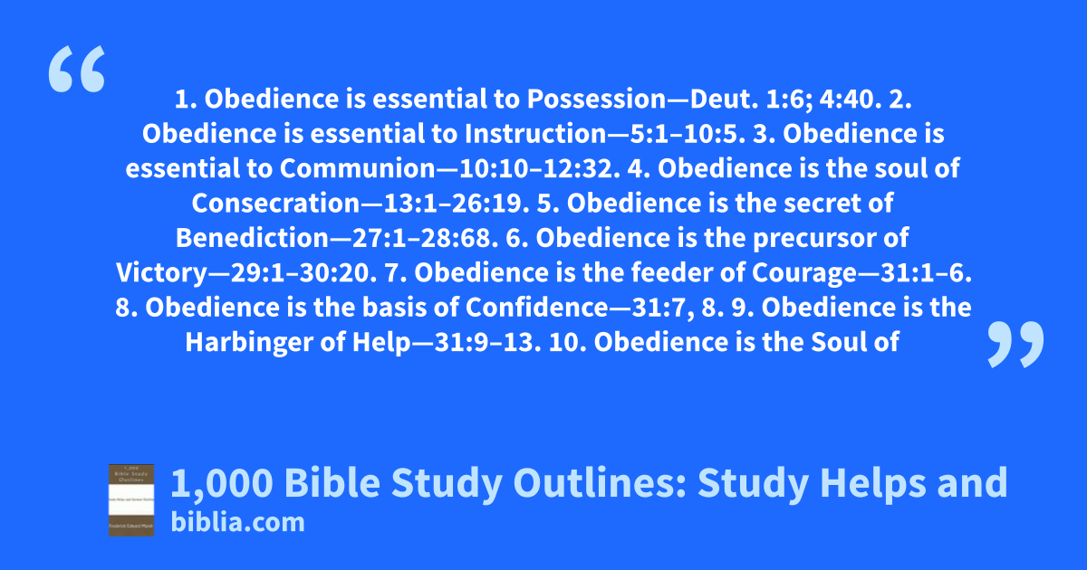 1. Obedience is essential to Possession—Deut. 1:6; 4:40. 2. Obedience is essential to Instruction—5:1–10:5. 3. Obedience is essential to Communion—10:10–12:32. 4. Obedience is the soul of Consecration—13:1–26:19. 5. Obedience is the secret of Benediction—27:1–28:68. 6. Obedience is the precursor of Victory—29:1–30:20. 7. Obedience is the feeder of Courage—31:1–6. 8. Obedience is the basis of Confidence—31:7, 8. 9. Obedience is the Harbinger of Help—31:9–13. 10. Obedience is the Soul of