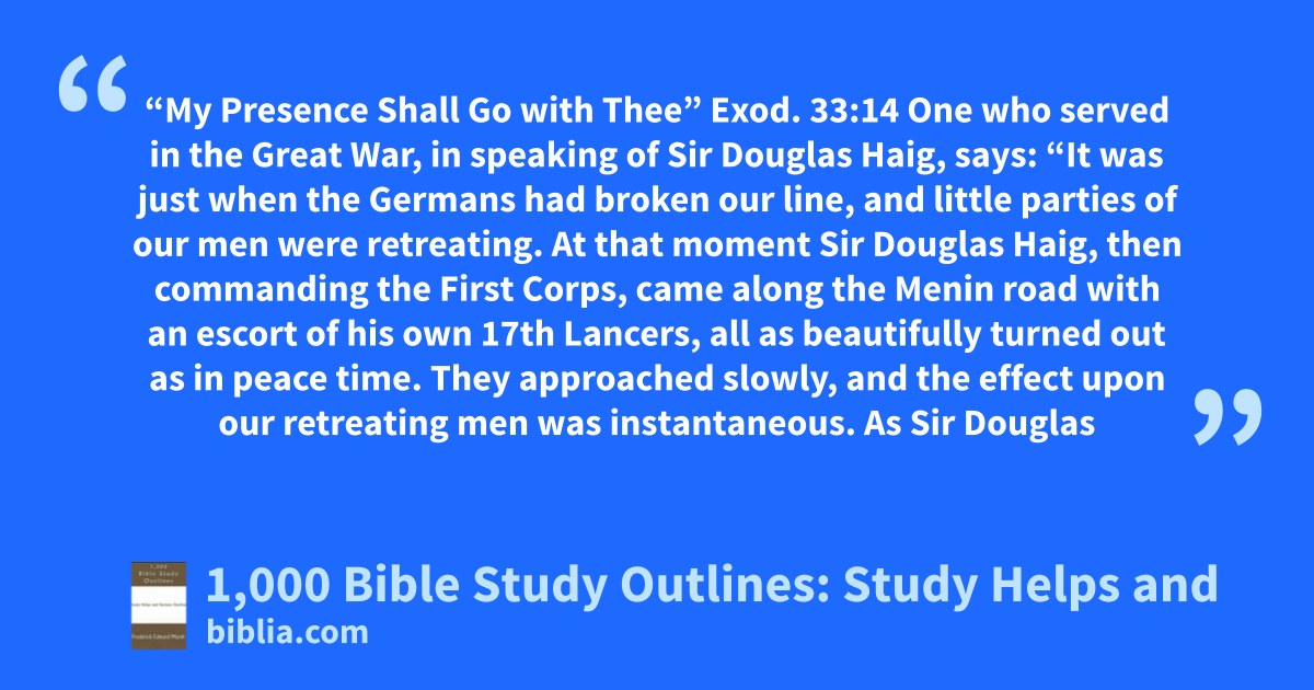 “My Presence Shall Go with Thee” Exod. 33:14 One who served in the Great War, in speaking of Sir Douglas Haig, says: “It was just when the Germans had broken our line, and little parties of our men were retreating. At that moment Sir Douglas Haig, then commanding the First Corps, came along the Menin road with an escort of his own 17th Lancers, all as beautifully turned out as in peace time. They approached slowly, and the effect upon our retreating men was instantaneous. As Sir Douglas