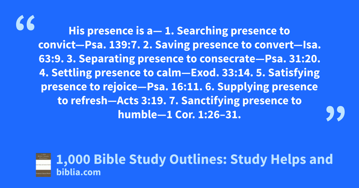 His presence is a— 1. Searching presence to convict—Psa. 139:7. 2. Saving presence to convert—Isa. 63:9. 3. Separating presence to consecrate—Psa. 31:20. 4. Settling presence to calm—Exod. 33:14. 5. Satisfying presence to rejoice—Psa. 16:11. 6. Supplying presence to refresh—Acts 3:19. 7. Sanctifying presence to humble—1 Cor. 1:26–31.