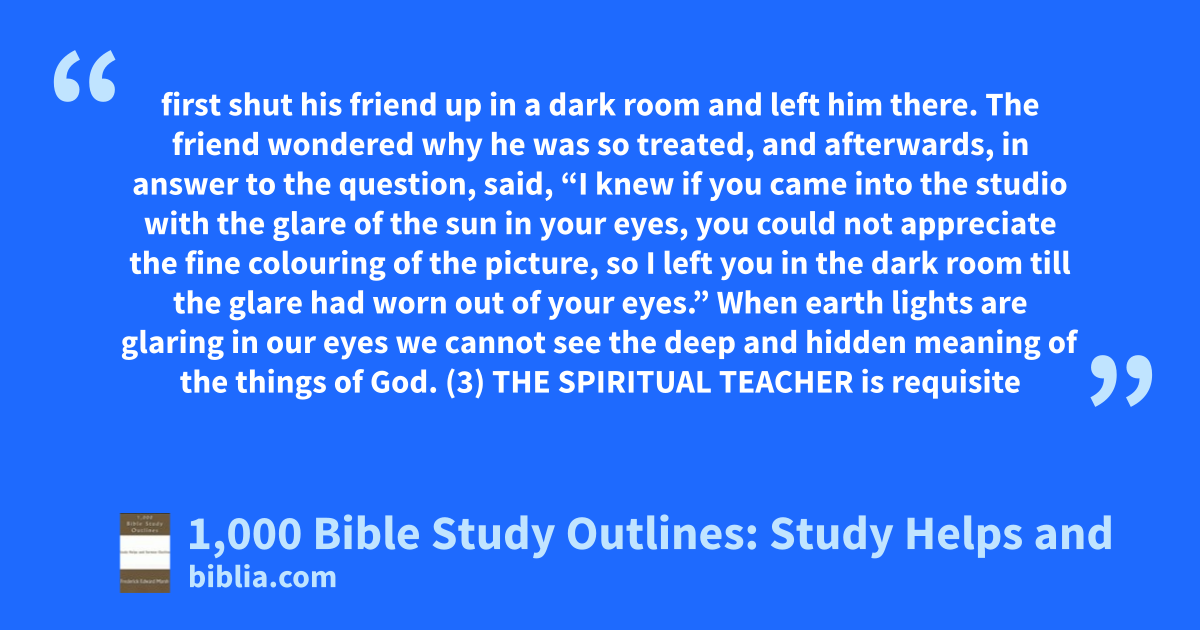 first shut his friend up in a dark room and left him there. The friend wondered why he was so treated, and afterwards, in answer to the question, said, “I knew if you came into the studio with the glare of the sun in your eyes, you could not appreciate the fine colouring of the picture, so I left you in the dark room till the glare had worn out of your eyes.” When earth lights are glaring in our eyes we cannot see the deep and hidden meaning of the things of God. (3) THE SPIRITUAL TEACHER is requisite