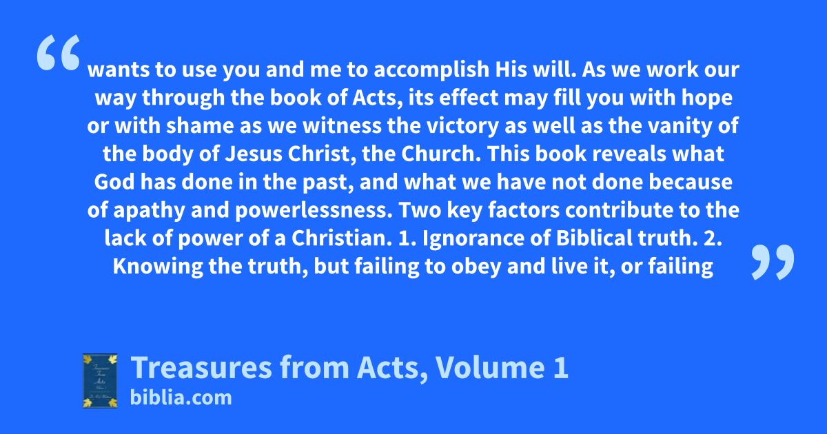 wants to use you and me to accomplish His will. As we work our way through the book of Acts, its effect may fill you with hope or with shame as we witness the victory as well as the vanity of the body of Jesus Christ, the Church. This book reveals what God has done in the past, and what we have not done because of apathy and powerlessness. Two key factors contribute to the lack of power of a Christian. 1. Ignorance of Biblical truth. 2. Knowing the truth, but failing to obey and live it, or failing