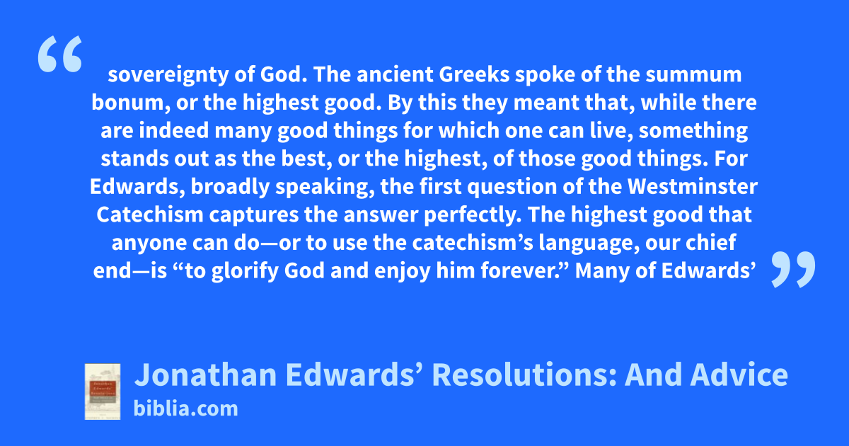 sovereignty of God. The ancient Greeks spoke of the summum bonum, or the highest good. By this they meant that, while there are indeed many good things for which one can live, something stands out as the best, or the highest, of those good things. For Edwards, broadly speaking, the first question of the Westminster Catechism captures the answer perfectly. The highest good that anyone can do—or to use the catechism’s language, our chief end—is “to glorify God and enjoy him forever.” Many of Edwards’