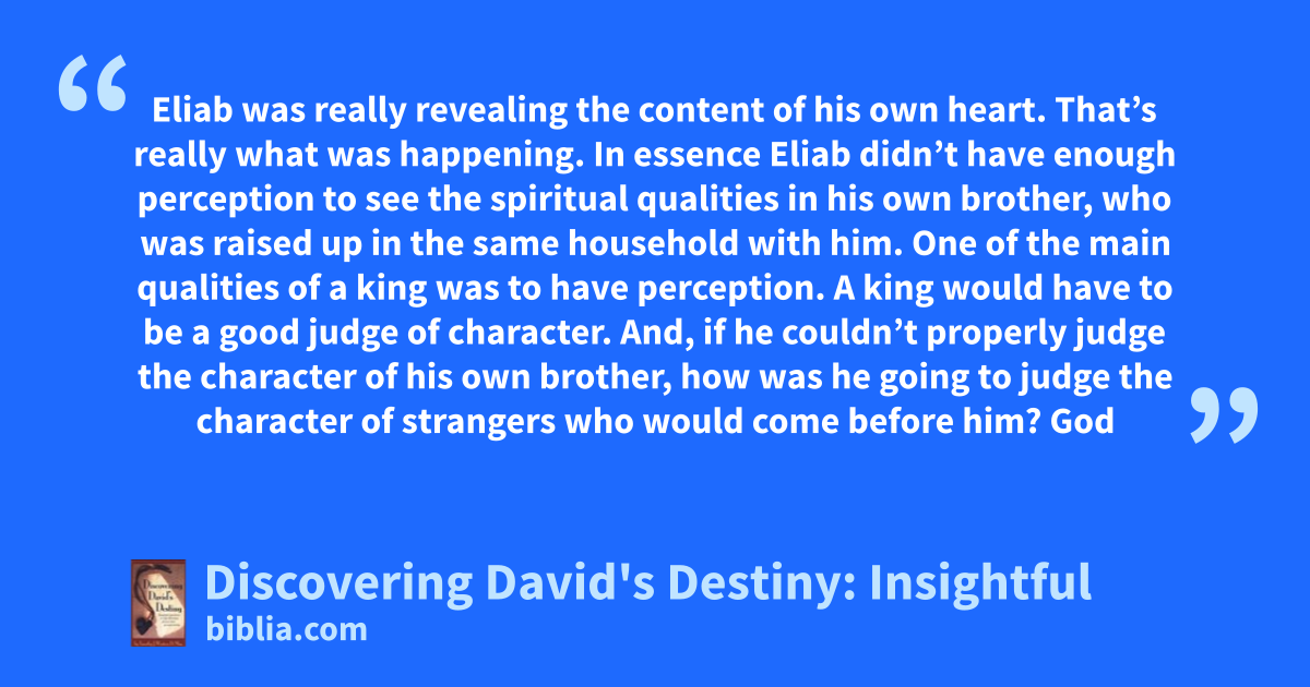 Eliab was really revealing the content of his own heart. That’s really what was happening. In essence Eliab didn’t have enough perception to see the spiritual qualities in his own brother, who was raised up in the same household with him. One of the main qualities of a king was to have perception. A king would have to be a good judge of character. And, if he couldn’t properly judge the character of his own brother, how was he going to judge the character of strangers who would come before him? God