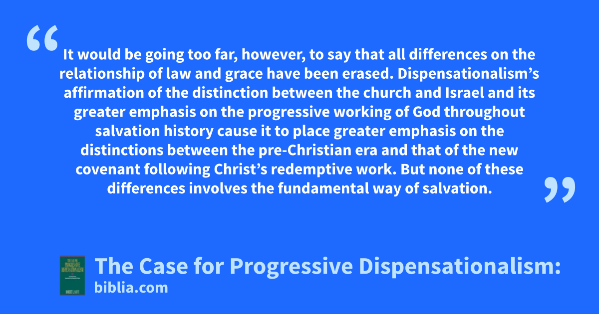 It would be going too far, however, to say that all differences on the relationship of law and grace have been erased. Dispensationalism’s affirmation of the distinction between the church and Israel and its greater emphasis on the progressive working of God throughout salvation history cause it to place greater emphasis on the distinctions between the pre-Christian era and that of the new covenant following Christ’s redemptive work. But none of these differences involves the fundamental way of salvation.