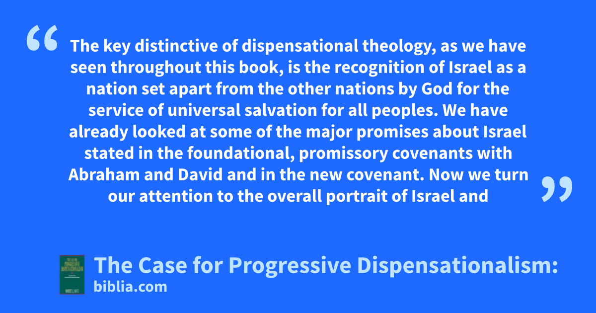 The key distinctive of dispensational theology, as we have seen throughout this book, is the recognition of Israel as a nation set apart from the other nations by God for the service of universal salvation for all peoples. We have already looked at some of the major promises about Israel stated in the foundational, promissory covenants with Abraham and David and in the new covenant. Now we turn our attention to the overall portrait of Israel and