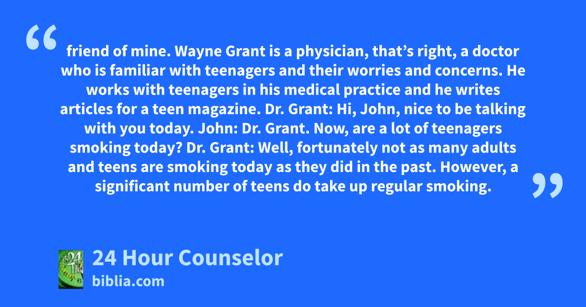 friend of mine. Wayne Grant is a physician, that’s right, a doctor who is familiar with teenagers and their worries and concerns. He works with teenagers in his medical practice and he writes articles for a teen magazine. Dr. Grant: Hi, John, nice to be talking with you today. John: Dr. Grant. Now, are a lot of teenagers smoking today? Dr. Grant: Well, fortunately not as many adults and teens are smoking today as they did in the past. However, a significant number of teens do take up regular smoking.