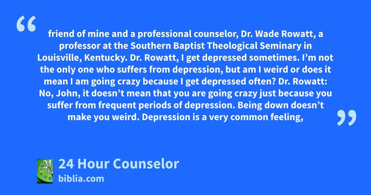 friend of mine and a professional counselor, Dr. Wade Rowatt, a professor at the Southern Baptist Theological Seminary in Louisville, Kentucky. Dr. Rowatt, I get depressed sometimes. I’m not the only one who suffers from depression, but am I weird or does it mean I am going crazy because I get depressed often? Dr. Rowatt: No, John, it doesn’t mean that you are going crazy just because you suffer from frequent periods of depression. Being down doesn’t make you weird. Depression is a very common feeling,