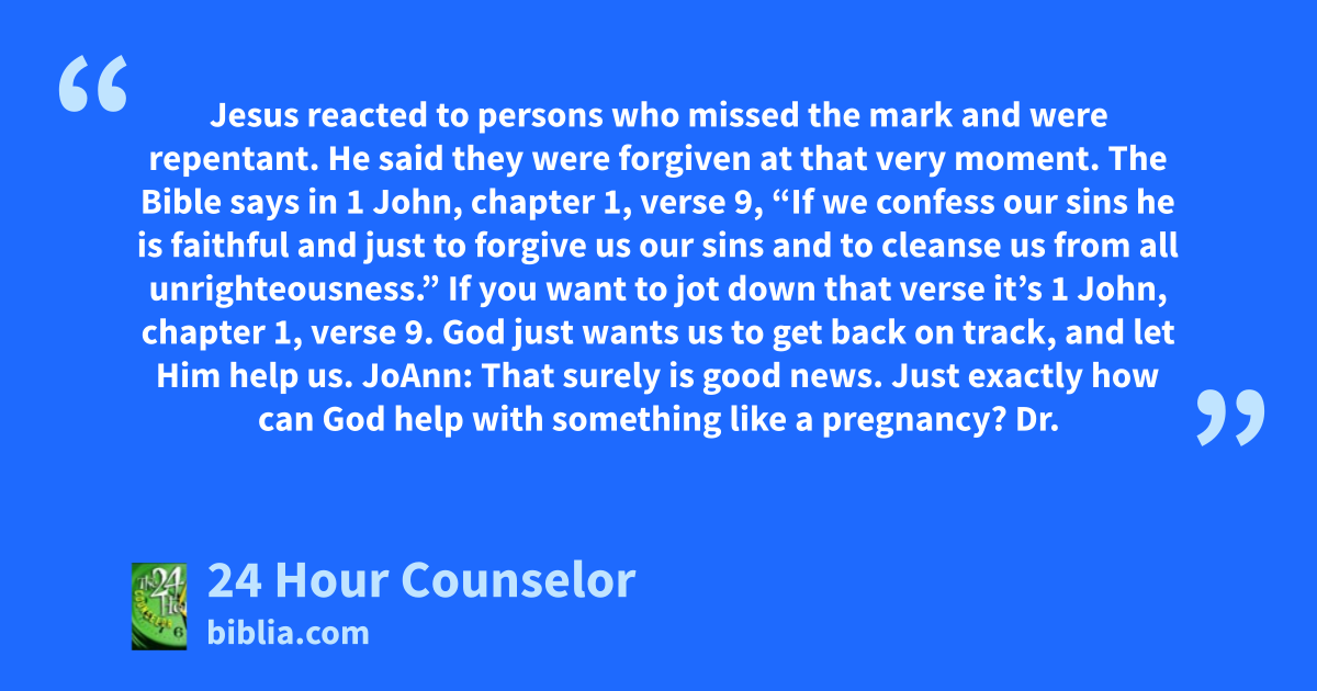 Jesus reacted to persons who missed the mark and were repentant. He said they were forgiven at that very moment. The Bible says in 1 John, chapter 1, verse 9, “If we confess our sins he is faithful and just to forgive us our sins and to cleanse us from all unrighteousness.” If you want to jot down that verse it’s 1 John, chapter 1, verse 9. God just wants us to get back on track, and let Him help us. JoAnn: That surely is good news. Just exactly how can God help with something like a pregnancy? Dr.