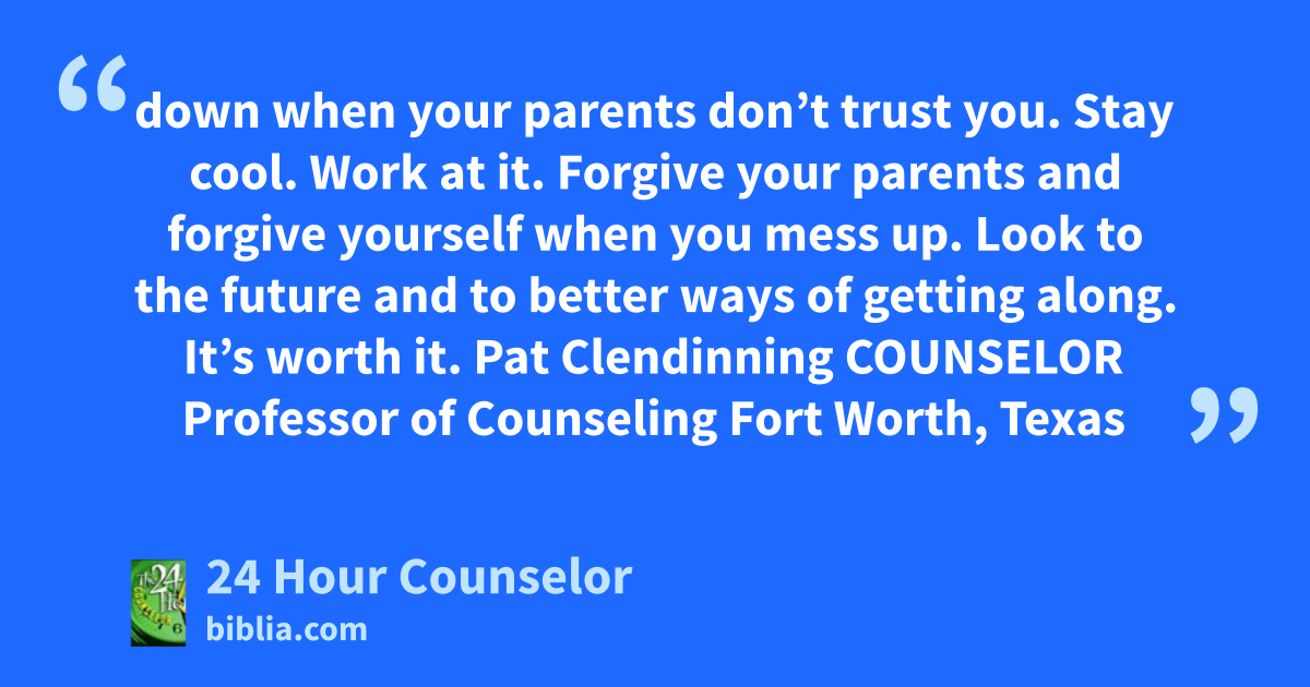 down when your parents don’t trust you. Stay cool. Work at it. Forgive your parents and forgive yourself when you mess up. Look to the future and to better ways of getting along. It’s worth it. Pat Clendinning COUNSELOR Professor of Counseling Fort Worth, Texas
