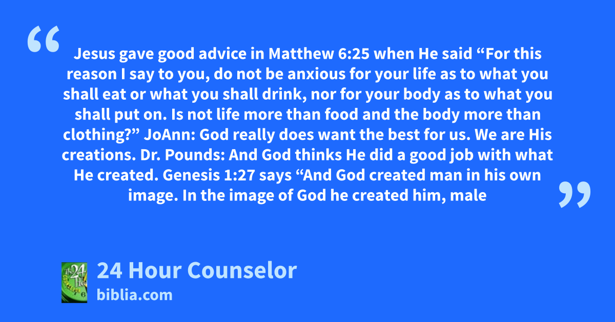 Jesus gave good advice in Matthew 6:25 when He said “For this reason I say to you, do not be anxious for your life as to what you shall eat or what you shall drink, nor for your body as to what you shall put on. Is not life more than food and the body more than clothing?” JoAnn: God really does want the best for us. We are His creations. Dr. Pounds: And God thinks He did a good job with what He created. Genesis 1:27 says “And God created man in his own image. In the image of God he created him, male