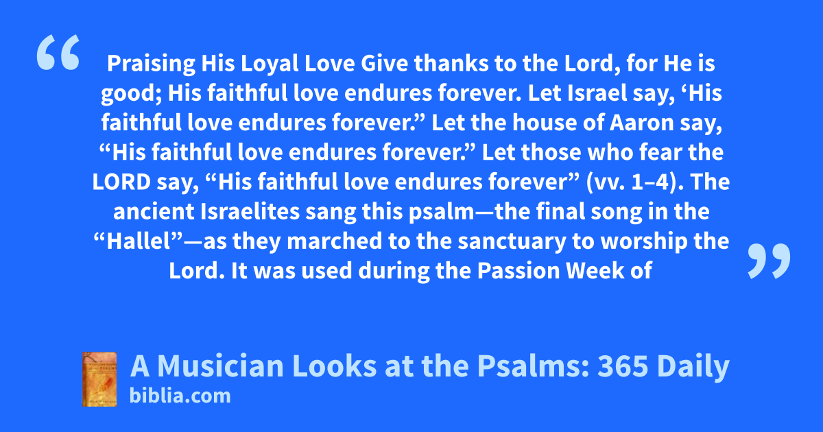 Praising His Loyal Love Give thanks to the Lord, for He is good; His faithful love endures forever. Let Israel say, ‘His faithful love endures forever.” Let the house of Aaron say, “His faithful love endures forever.” Let those who fear the LORD say, “His faithful love endures forever” (vv. 1–4). The ancient Israelites sang this psalm—the final song in the “Hallel”—as they marched to the sanctuary to worship the Lord. It was used during the Passion Week of