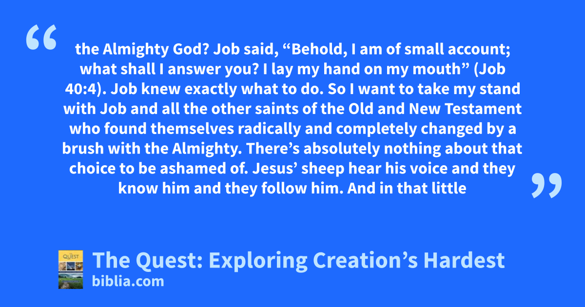 the Almighty God? Job said, “Behold, I am of small account; what shall I answer you? I lay my hand on my mouth” (Job 40:4). Job knew exactly what to do. So I want to take my stand with Job and all the other saints of the Old and New Testament who found themselves radically and completely changed by a brush with the Almighty. There’s absolutely nothing about that choice to be ashamed of. Jesus’ sheep hear his voice and they know him and they follow him. And in that little
