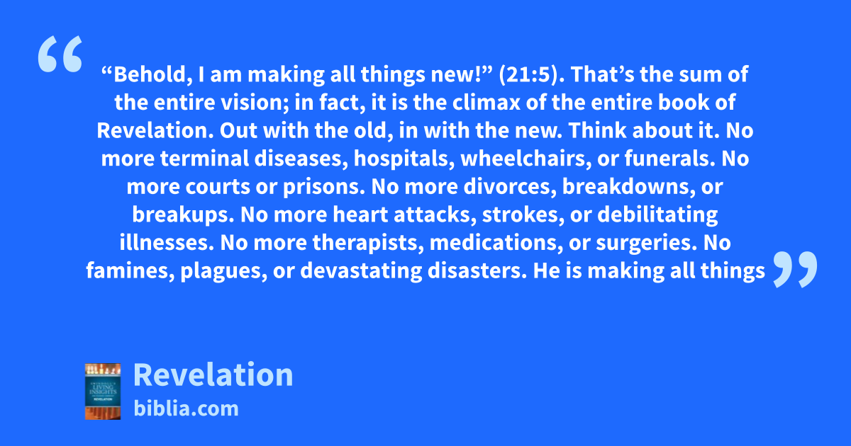 “Behold, I am making all things new!” (21:5). That’s the sum of the entire vision; in fact, it is the climax of the entire book of Revelation. Out with the old, in with the new. Think about it. No more terminal diseases, hospitals, wheelchairs, or funerals. No more courts or prisons. No more divorces, breakdowns, or breakups. No more heart attacks, strokes, or debilitating illnesses. No more therapists, medications, or surgeries. No famines, plagues, or devastating disasters. He is making all things