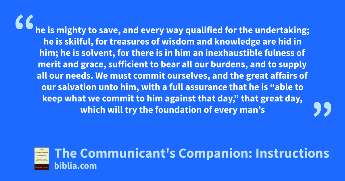 Matthew Henry, most famous for his Complete Commentary on the Whole Bible, outlines how to partake in the Lord's Supper. Very practical, insightful, and thorough. About the Author Matthew Henry (1662-1714) was a Presbyterian minister in England, who is best known for his beloved devotional commentary on the Bible. He began his commentary on the Bible in 1704. He completed his work up to the end...