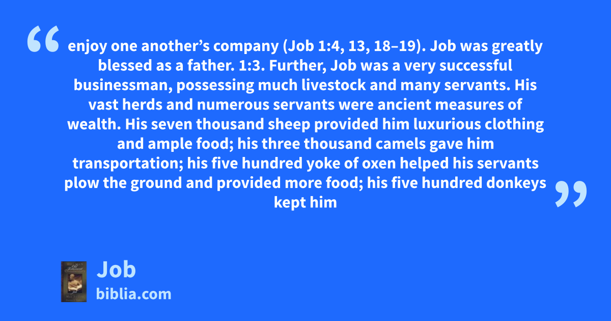 enjoy one another’s company (Job 1:4, 13, 18–19). Job was greatly blessed as a father. 1:3. Further, Job was a very successful businessman, possessing much livestock and many servants. His vast herds and numerous servants were ancient measures of wealth. His seven thousand sheep provided him luxurious clothing and ample food; his three thousand camels gave him transportation; his five hundred yoke of oxen helped his servants plow the ground and provided more food; his five hundred donkeys kept him
