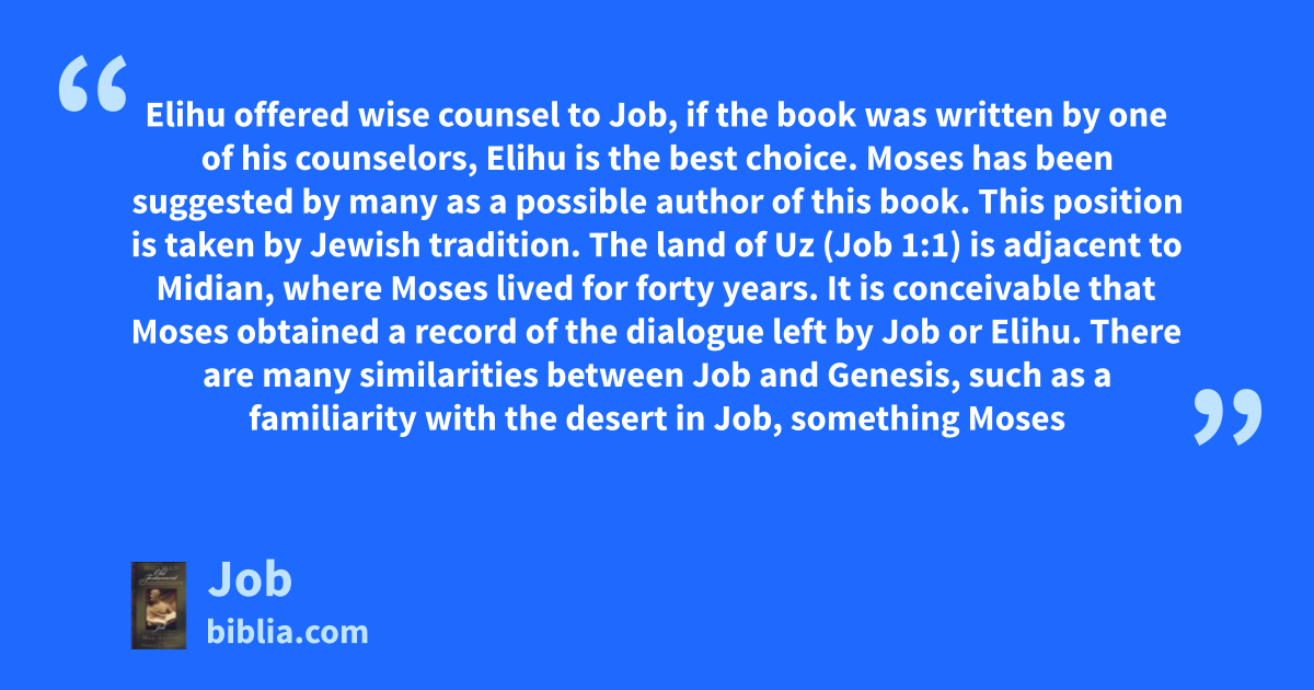 Elihu offered wise counsel to Job, if the book was written by one of his counselors, Elihu is the best choice. Moses has been suggested by many as a possible author of this book. This position is taken by Jewish tradition. The land of Uz (Job 1:1) is adjacent to Midian, where Moses lived for forty years. It is conceivable that Moses obtained a record of the dialogue left by Job or Elihu. There are many similarities between Job and Genesis, such as a familiarity with the desert in Job, something Moses